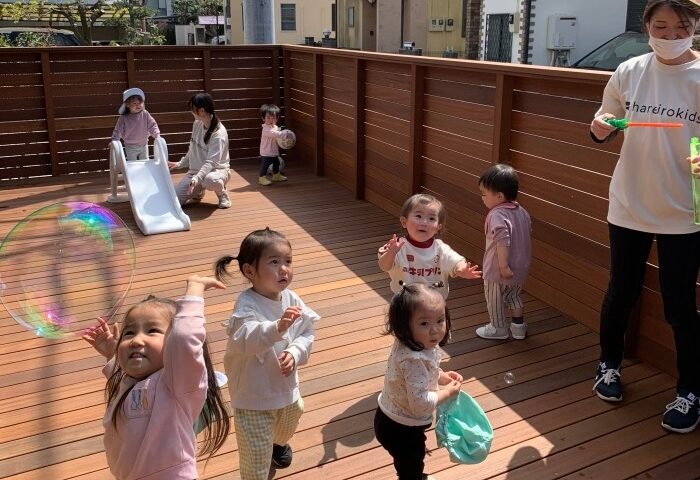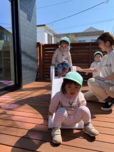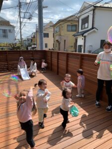 デッキの滑り台を楽しんだり、キラキラシャボン玉を追いかけたり、