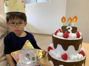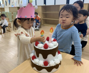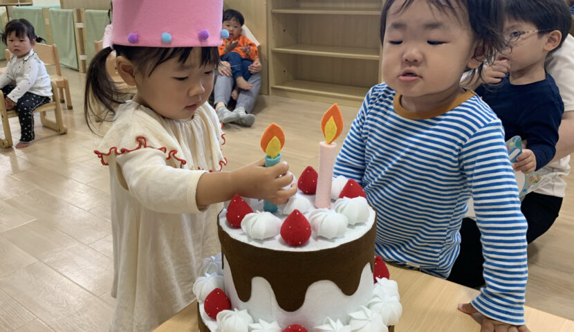 先生たちからのお祝いの言葉に加えて、みんなでおうたをうたったり、手作りのバースデーケーキでお祝いしたりと、あたたかい時間が流れました。