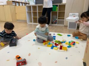 手に取り、中にブロックやボールを詰めたり、揺らしてカタカタと音を楽しんだり…