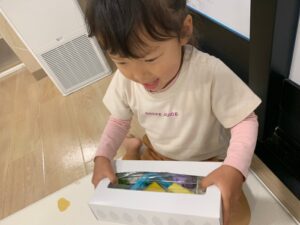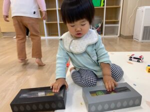 箱を並べて繋げると、なんとなく電車の形に見えてそのまま「しゅっぱつ!」とごっこ遊びが始まりました。